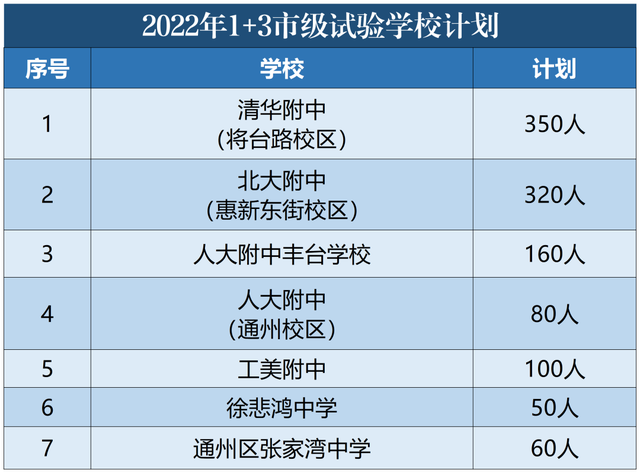 根據2023年1+3項目數據顯示,2023年市級試驗學校共有7所,其中不乏清華附中、北大附中、人大附中等知名中學分校。在區級試驗學校方面,海淀區1+3項目參與學校共計10所,計劃招生人數也為所有區中最多。