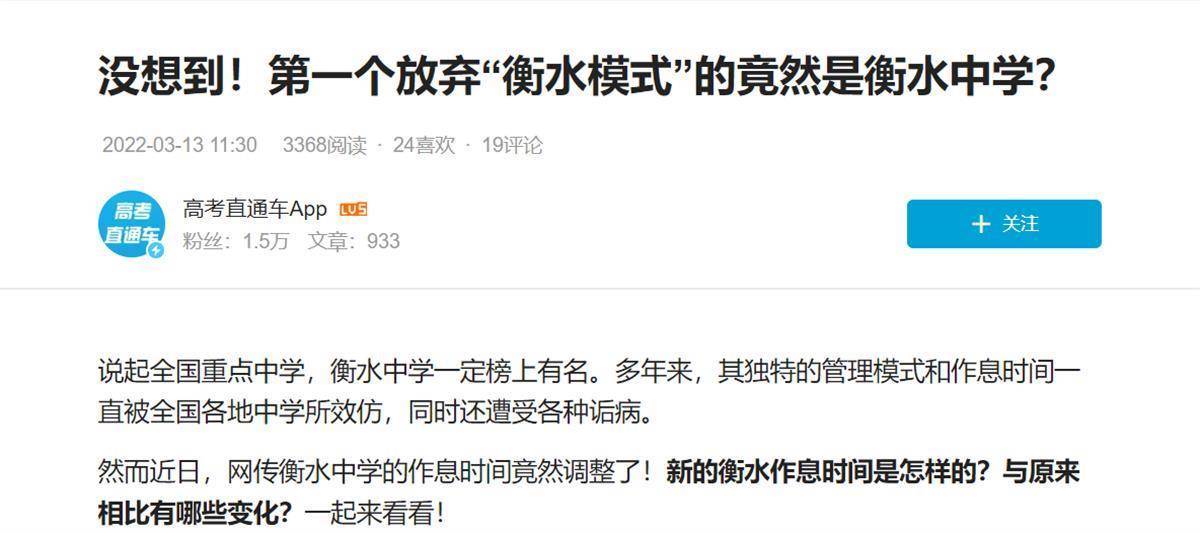 衡水中學的教學改革動態引來了媒體關注,上了熱搜。衡水中學是一所名聲在外的超級中學,因高考升學率與考入清華北大的人數都令人矚目,而被稱為“高考工廠”。同時伴隨爭議的是學校的管理模式,被認為是應試教育的典型,學生成了按表操作的流水線一員,只是考試機器。