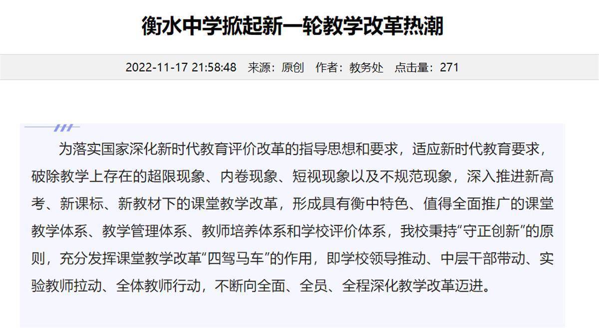 河北衡水中學網站11月17日發文介紹了學校新一輪教學改革進展,表示要破除教學上存在的超限現象、內卷現象、短視現象以及不規范現象,深入推進新高考、新課標、新教材下的課堂教學改革,形成具有衡中特色、值得全面推廣的課堂教學體系、教學管理體系、教師培養體系和學校評價體系。(據11月19日澎湃新聞)