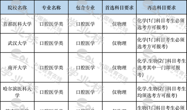 在3+1+2模式下,大部分院校的口腔醫學類專業要求首選科目必須是物理,如首都醫科大學、武漢大學等。