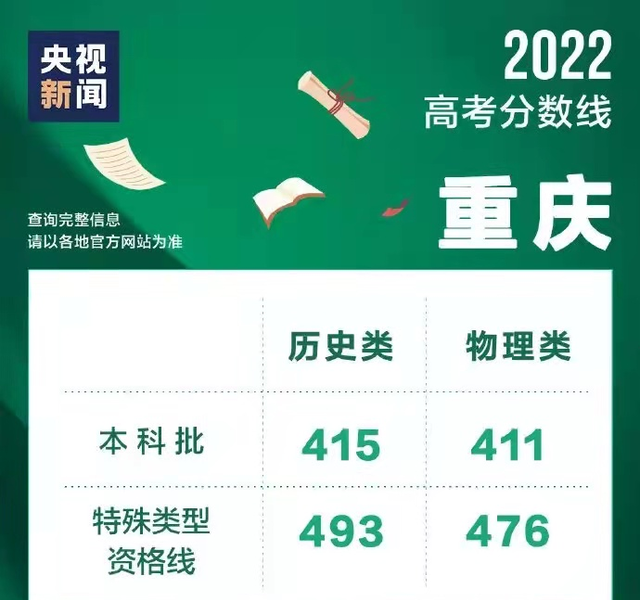2023重慶高考分數線昨日發布: 本科批歷史類415分、物理類411分 特殊類型(一本)歷史類493分,物理類476分 2018~2023年重慶市內大學投檔分數線參考資料同時附上。 2018~2023年重慶市內大學投檔分數線主要供考生填報志愿時參考。它的主要作用是更快地篩選出目標院校,減少考