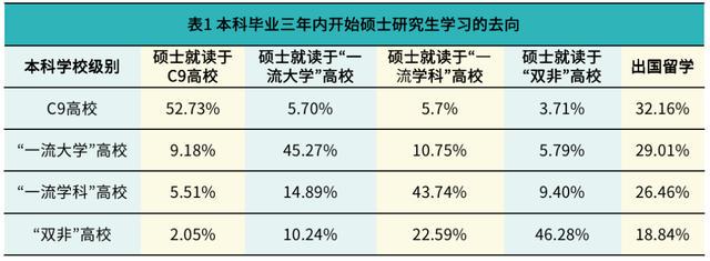 本科就讀于“一流大學”的同學中,有半數(shù)留在了“一流大學”讀研,另有接近一成的同學進入更好的C9高校讀研;至少兩成的“一流學科”高校本科生被C9或“一流大學”的研究生院錄取,另有近半數(shù)同學留在“一流學科”高校讀研;超過三成的“雙非”本科畢業(yè)生升入C9或“雙一流”高校讀研。同時,本科在“好學校”不代表研究生就一定能繼續(xù)留在“好學校”。C9和“一流大學”的本科畢業(yè)生“降級讀研”的比例均超過了10%,也有9%的“一流學科”本科生最終在“雙非”高校讀研。