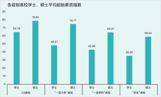 從起薪來看,不論本科出身哪里,C9高校的碩士生畢業(yè)時的平均起薪比“一流大學”碩士生高5.43%,“一流大學”碩士生起薪比“一流學科”碩士生高16.17%,“一流學科”的碩士生起薪比“雙非”碩士生高9.02%。