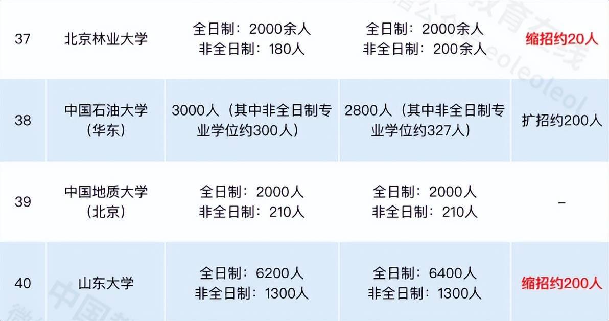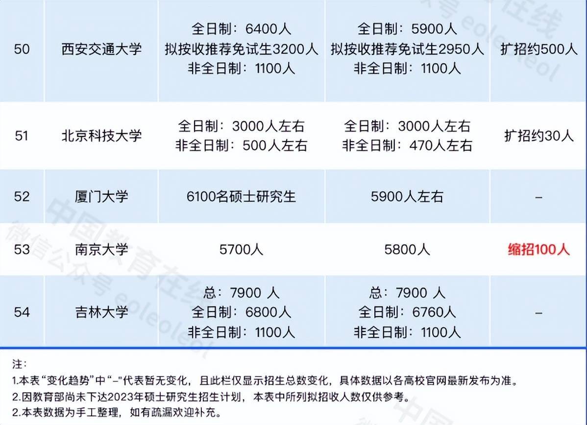 山東大學大約縮招200人,縮招的是全日制,招生人數由6400人變成了6200人,南京大學縮招100人,招生人數由5800人變成了5700人。