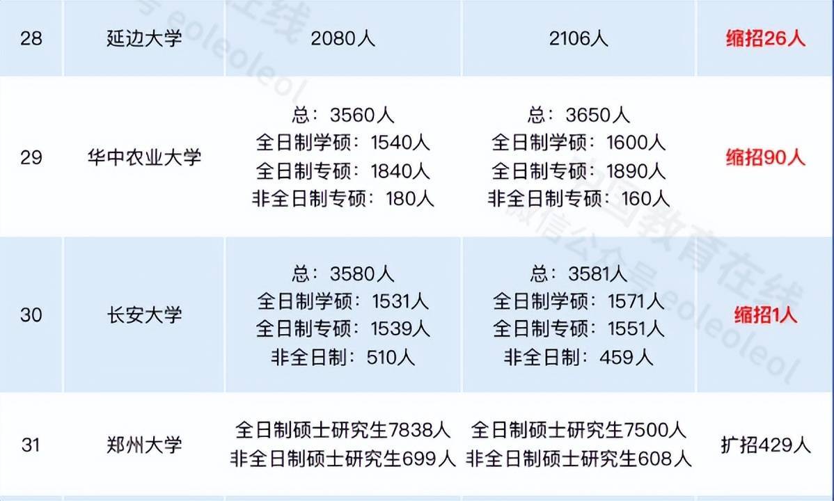 延邊大學縮招了26人,招生人數由2106人變成了2080人,華中農業大學縮招了90人,招生人數由3650人變成了3560人,縮招的名額都是全日制。