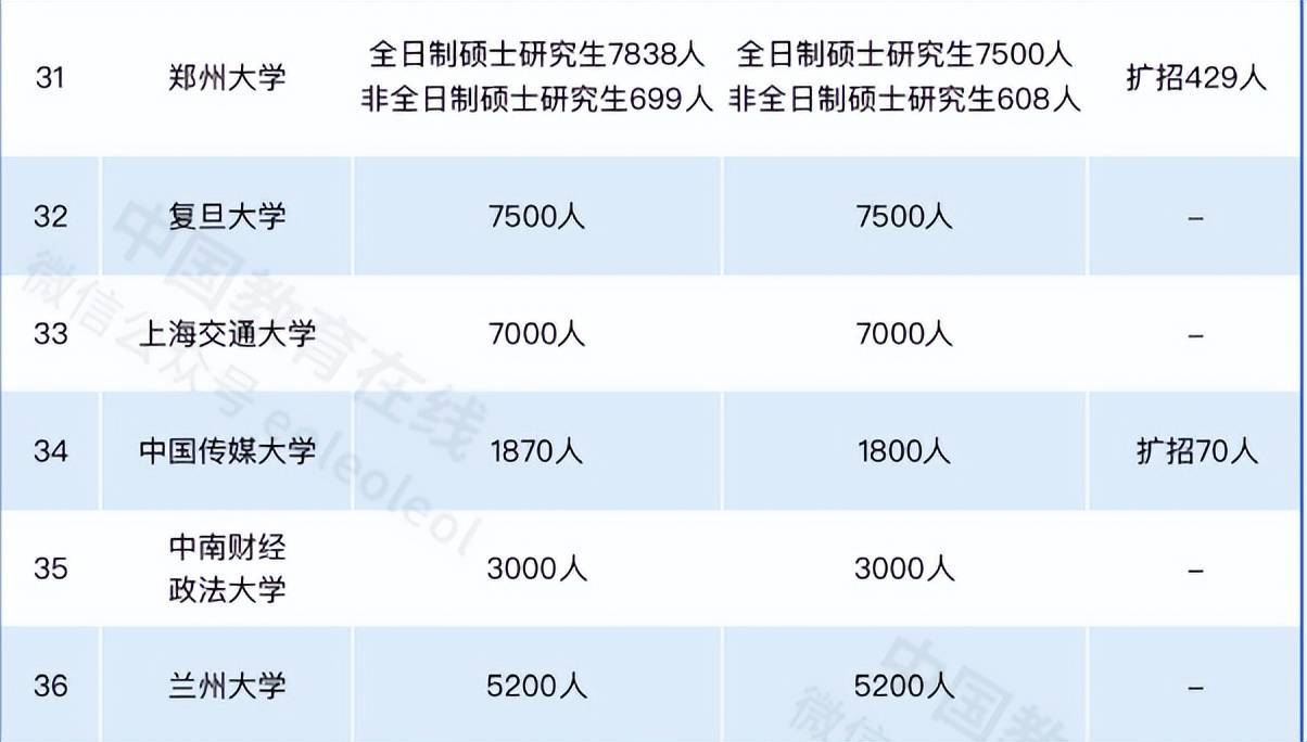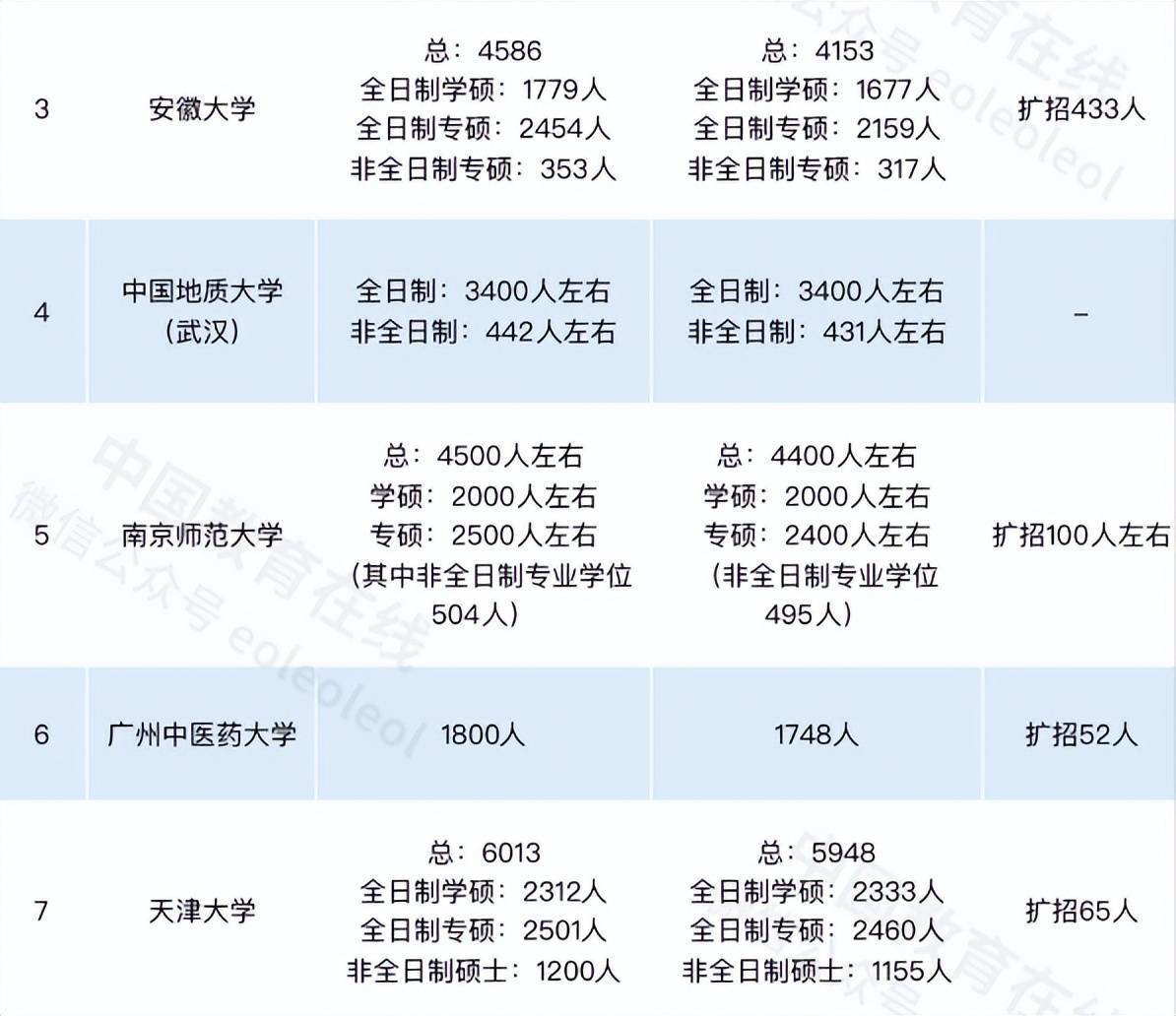 南京師范大學擴招了100人左右,招生人數由4400人左右增加到4500人左右,擴招的是專碩和非全日制,廣州中醫藥大學擴招了52人,招生人數由1748人增加到1800人。
