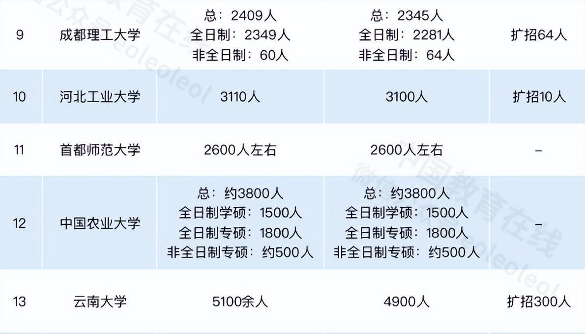 天津大學擴招了65人,招生人數由5948人增加到6013人,擴招的是專碩和非全,成都理工大學擴招了64人,招生人數由2345人增加到2409人,擴招的是全日制名額。