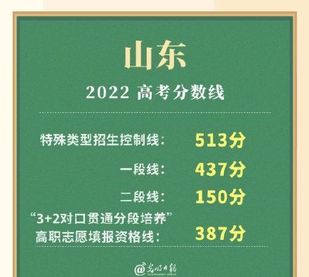 山東2023年夏季高考普通類分數線:特殊類型招生控制線:513分;一段線:437分;二段線:150分;“3+2對口貫通分段培養”高職志愿填報資格線:387分。
