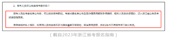 再比如2023年浙江省考報名指南中直接明確,考察名單公布前可以放棄。名單公布后放棄,會記入誠信檔案。確定錄用后放棄或無正當理由逾期不報到的,2年內不能再報考浙江省考。