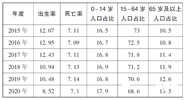 【例】表 2015—2020年我國出生率和死亡率(‰)、年齡結(jié)構(gòu)分布(%)數(shù)據(jù)表