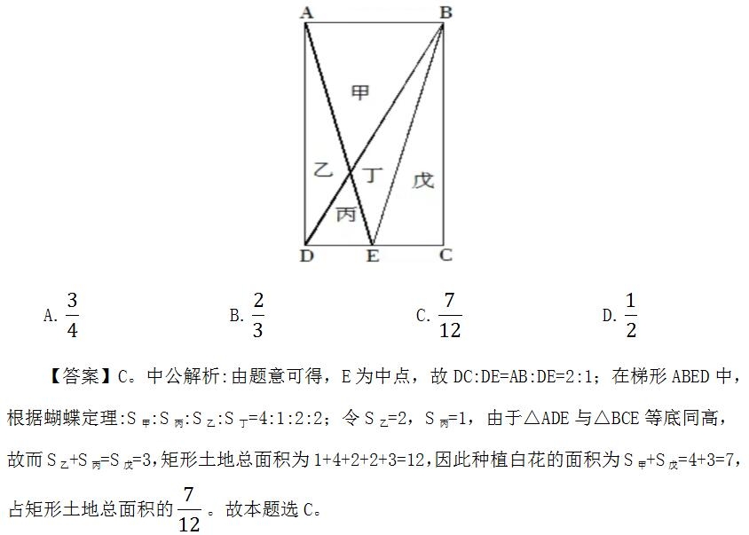 【例1】一塊種植花卉的矩形土地如圖所示,AD邊長是AB的2倍,E為CD邊的中點,甲、乙、丙、丁、戊區域分別種植白花、紅花、黃花、紫花、白花。問種植白花的面積占矩形土地面積的: