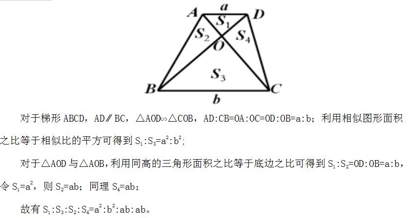 梯形蝴蝶定理是平面幾何中的重要定理,由于該定理的幾何圖形形似蝴蝶,故以“蝴蝶”來命名,其背后關于面積和邊的比例性質引出了一系列定理,稱之為“蝴蝶定理”。圖形如下圖所示: