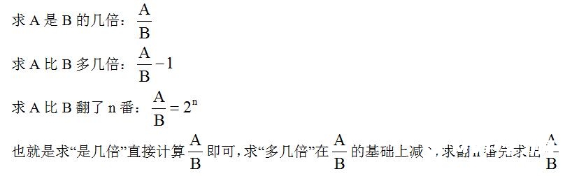 通過以上的幾道例題,會(huì)發(fā)現(xiàn)其實(shí)主要的“陷阱”還是出現(xiàn)在“是幾倍”和“多幾倍”的考察,而“是幾倍”一般會(huì)出現(xiàn)在:A是(為)/超過(大于)/不到(小于)B的多少倍,此時(shí)直接代入公式