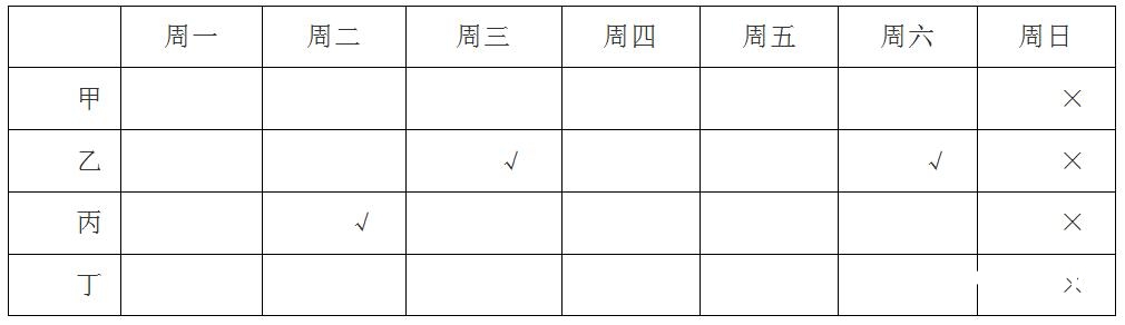 【核心解析】D。題干涉及人和時間用車的對應,兩類信息對應,用列表法。題干確定信息,是丙在周二用車畫√,周日沒有人會用車畫×。由①知,乙是在周三和周六用車,周三和周六畫√。由②丁必須在丙之后用車且只有一輛車,由表中可以看出,丁只能在周四或周五用車,而③得知沒有人能連續用2天車,則丁不可能用車2天,故本題選D。