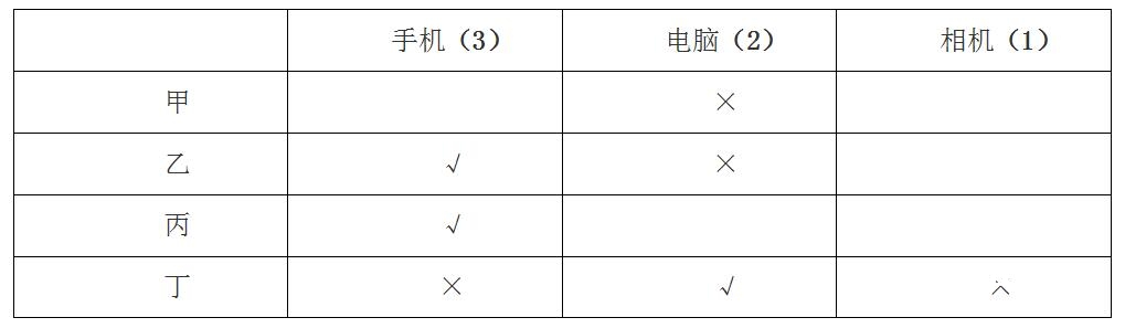 【例1】甲、乙、丙、丁四名青少年擁有手機、電腦、相機三種電子產品的情況如下: