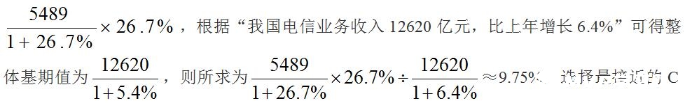 【核心解析】C。由材料可知,題干中求的是拉動(dòng)…增長(zhǎng),可以直接運(yùn)用公式,根據(jù)“在移動(dòng)通信業(yè)務(wù)中移動(dòng)數(shù)據(jù)及互聯(lián)網(wǎng)收入5489億元,比上年增長(zhǎng)26.7%”可得增長(zhǎng)量為