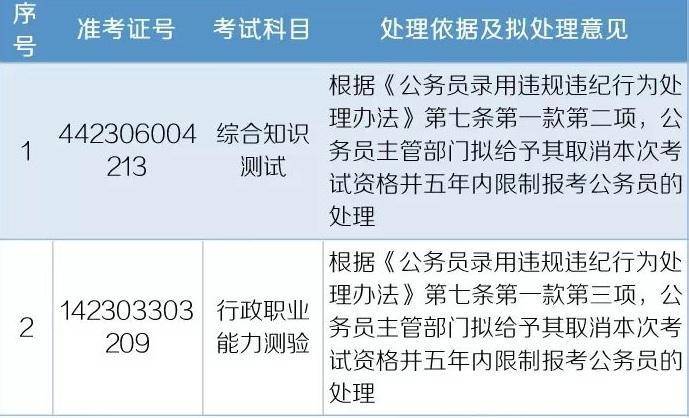 這其中,73名考生存在違規(guī)違紀(jì)行為或被認(rèn)定為雷同答卷考生,擬給予其“當(dāng)次該科目考試成績(jī)?yōu)榱惴值奶幚?rdquo;;2名考生被認(rèn)定違規(guī)違紀(jì),擬給予其取消本次考試資格并五年內(nèi)限制報(bào)考公務(wù)員的處理。