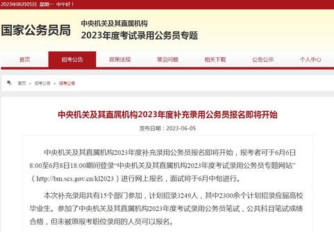 本次補充錄用共有15個部門參加,計劃招錄3249人,其中2300余個計劃招錄應屆高校畢業生。參加了中央機關及其直屬機構2023年度考試錄用公務員筆試,公共科目筆試成績合格,但未被原報考職位錄用的人員可以報名。