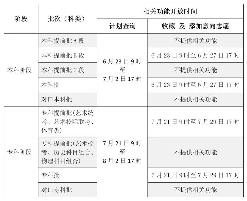 志愿填報輔助系統(tǒng)分本科階段和專科階段兩個時間段進行開放,各階段包含批次及其相關功能開放時間安排如下。