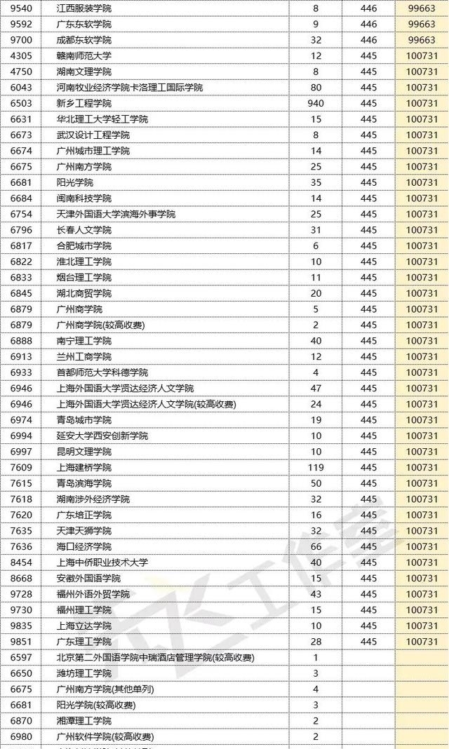理科投檔分446分—457分之間的高校有94所(包含較高收費、單列、獨立學院、合作辦學等),其中: