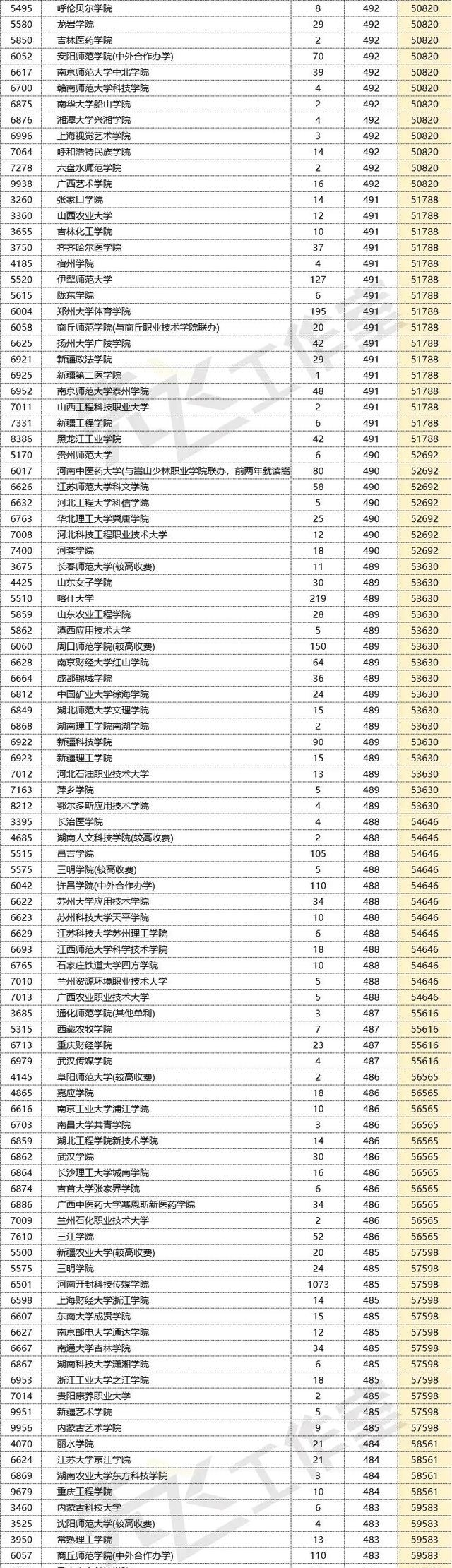 文科投檔分483-491分的高校有88所(包含較高收費、單列、合作辦學等),其中:喀什大學489分、位次53630