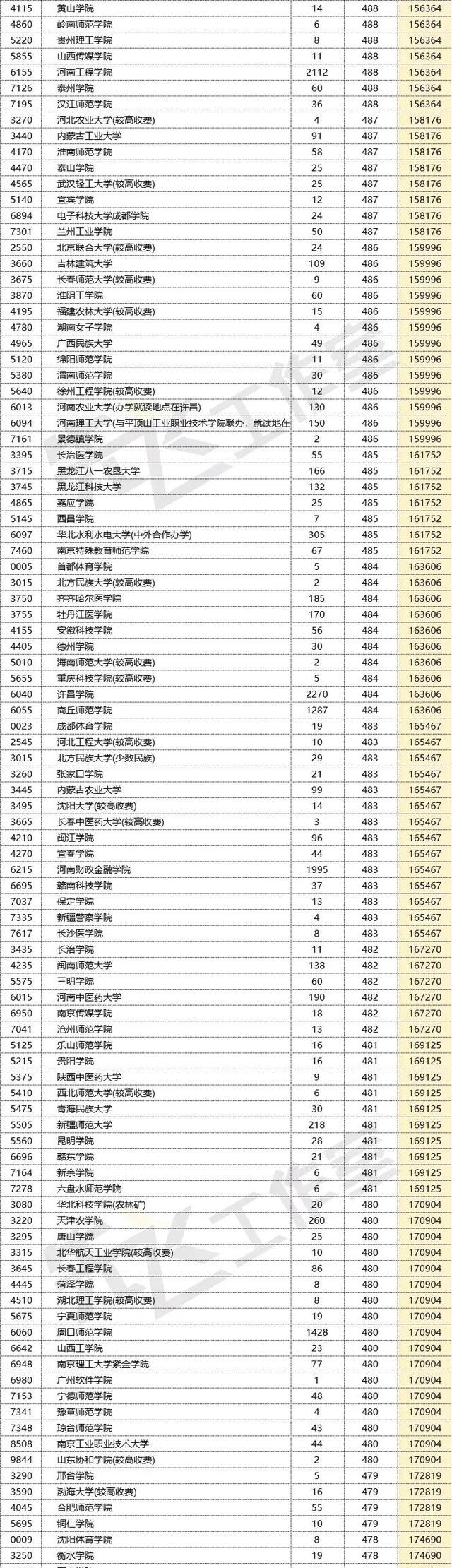 許昌學院、商丘師范學院、安徽科技學院484分、位次163606