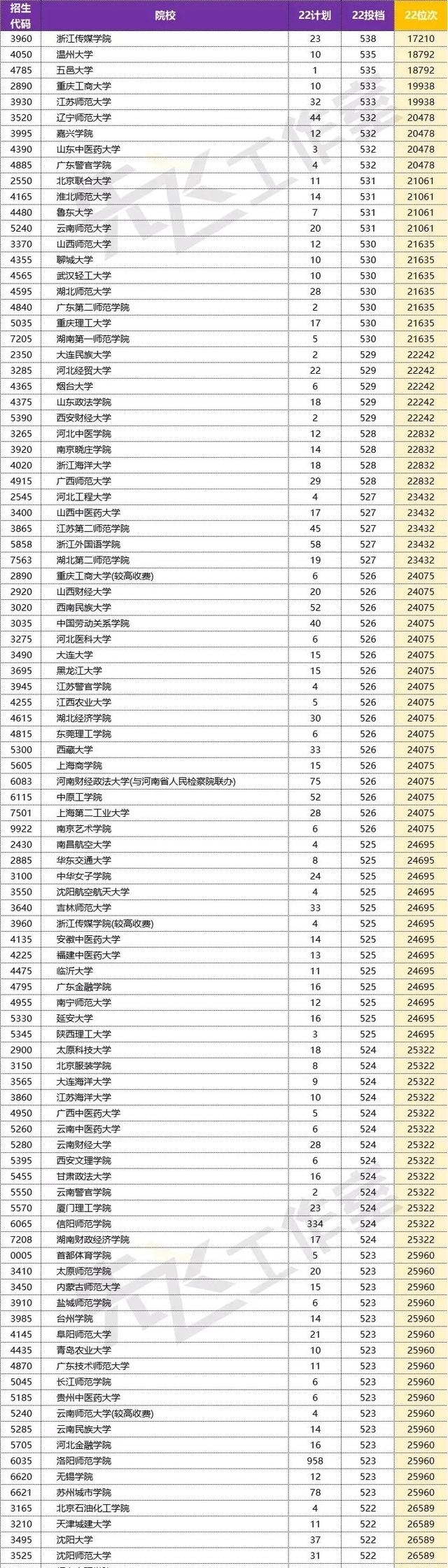 河北工程大學、山西中醫藥大學、江蘇第二師范、浙江外國語、湖北第二師范527分、位次23432