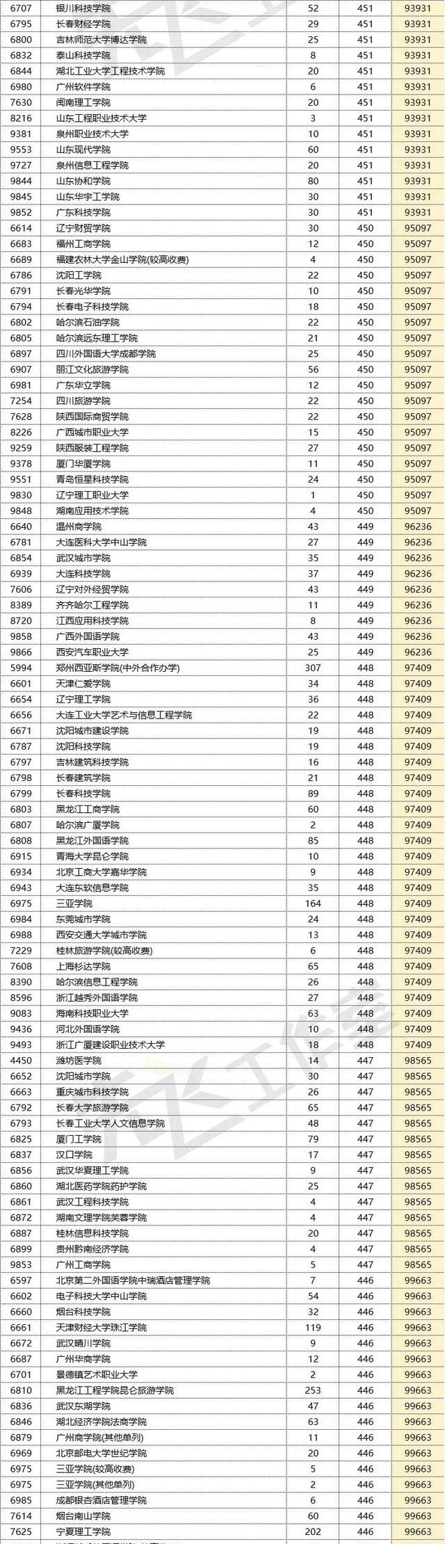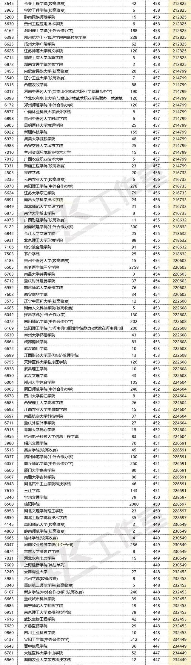 鄭州師范(中外合作辦學)、新疆科技學院等457分、位次214799