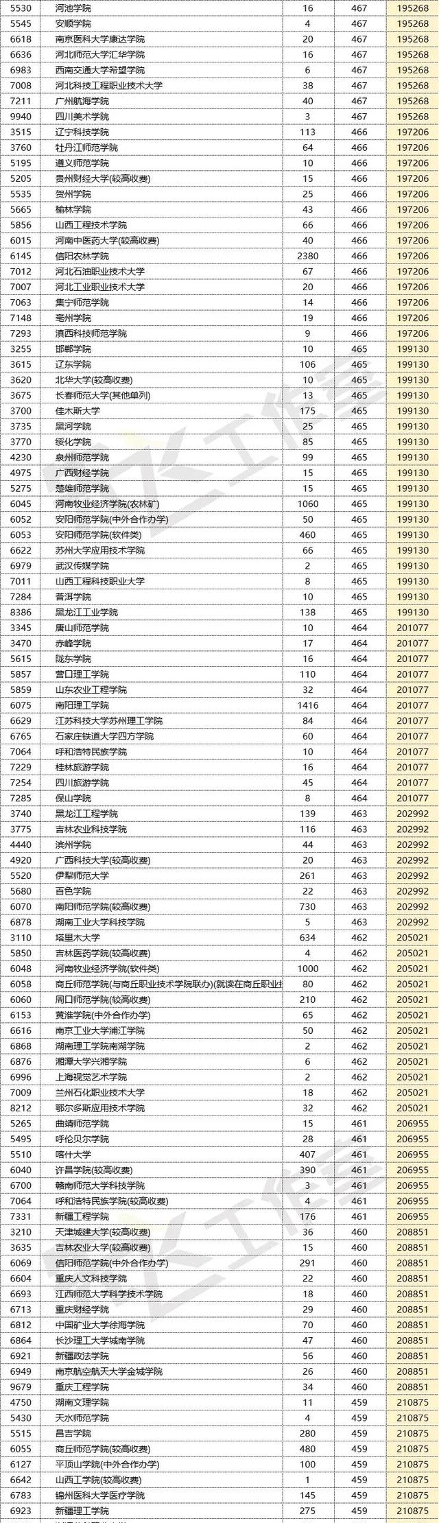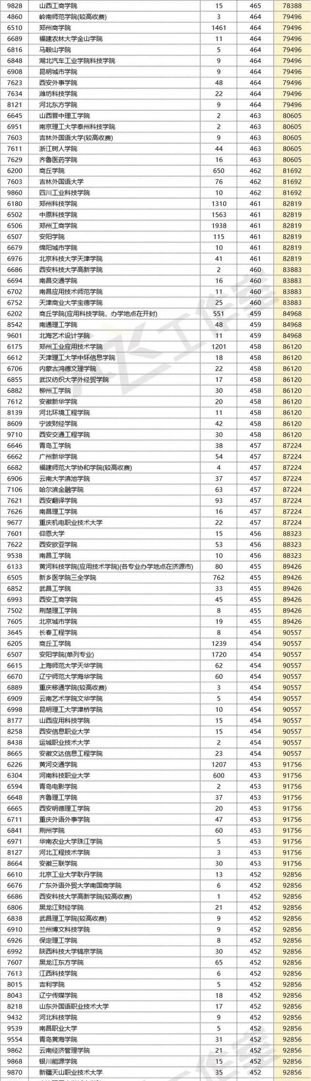 鄭州科技學院、中原科技學院(原河南師范大學新聯學院)、鄭州工商學院、安陽學院461分、位次82819