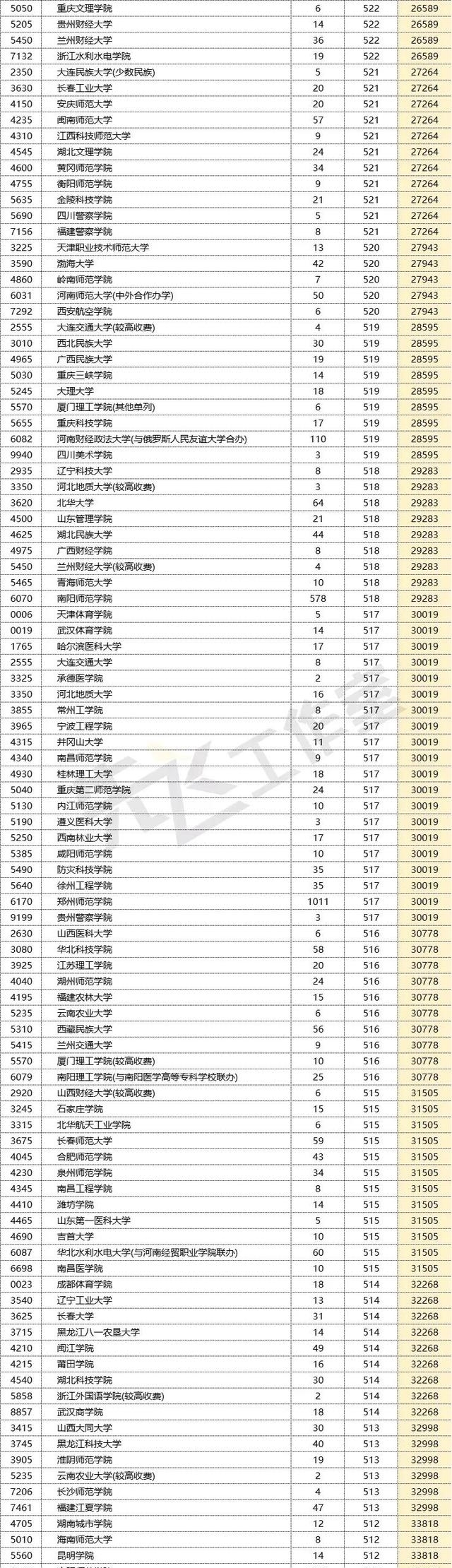 山西師范大學、聊城大學、武漢輕工大學、湖北師范大學、廣東第二師范、重慶理工大學、湖南第一師范530分、位次21635