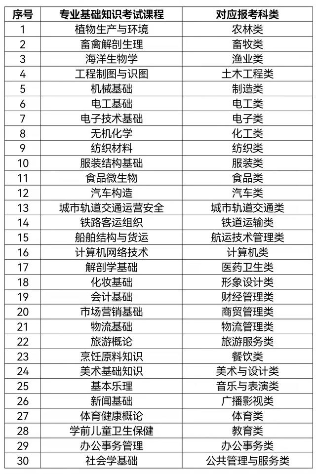 福建省中職學校學業水平專業基礎知識考試課程與報考科類對應表