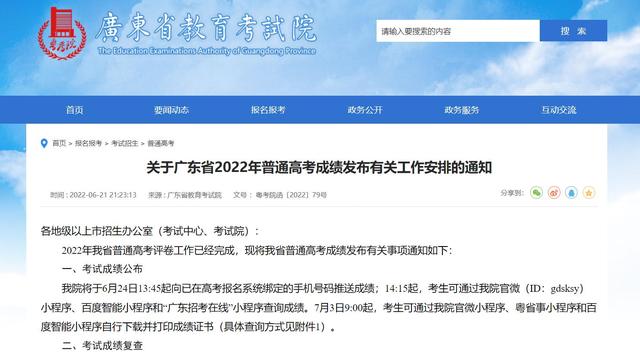 6月21日晚,廣東省教育考試院發(fā)布了關(guān)于廣東省2023年普通高考成績(jī)發(fā)布有關(guān)工作安排的通知。其中提到,2023年廣東省普通高考評(píng)卷工作已經(jīng)完成,廣東省教育考試院將于6月24日13:45起向已在高考報(bào)名系統(tǒng)綁定的手機(jī)號(hào)碼推送成績(jī);14:15起,考生可通過(guò)該院官微(ID:gdsksy)小程序、百度智能小程序和“廣東招考在線”小程序查詢成績(jī)。7月3日9:00起,考生可通過(guò)該院官微小程序、粵省事小程序和百度智能小程序自行下載并打印成績(jī)證書(shū)。