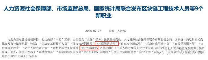 2024年7月7日,人社部聯合市場監管總局、國家統計局將“互聯網營銷師”作為新職業向社會發布,還發布了“直播銷售員”、“互聯網信息審核員”等5個工種。