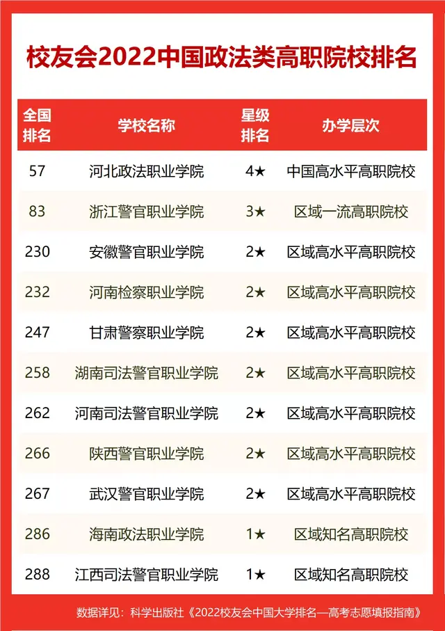 在2023校友會(huì)中國(guó)高職院校排名中,河北政法職業(yè)學(xué)院全國(guó)排名第57名,雄居2023中國(guó)政法類高職院校排名第一。浙江警官職業(yè)學(xué)院(第83名)列第2,安徽警官職業(yè)學(xué)院(第230名)居第3。