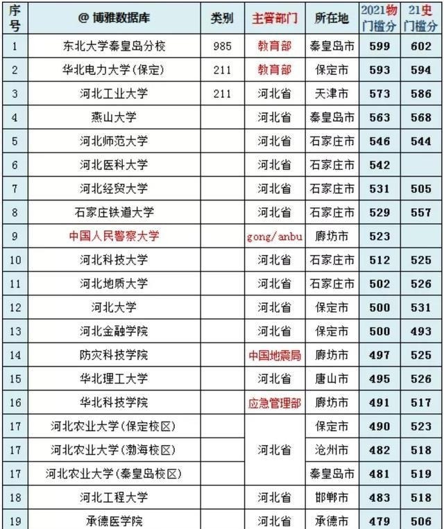 1.東北大學秦皇島分校;2.華北電力大學(保定);3.河北工業大學;4.燕山大學;5.河北師范大學;6.河北醫科大學;7.河北經貿大學;8.石家莊鐵道大學;9.中國人民警察大學;10.河北科技大學;11.河北地質大學;12.河北大學;13.河北金融學院;14.防災科技學院;15.華北理工大學;16.華北科技學院;17.河北農業大學;18.河北工程大學;19.承德醫學院;20.北華航天工業學院。