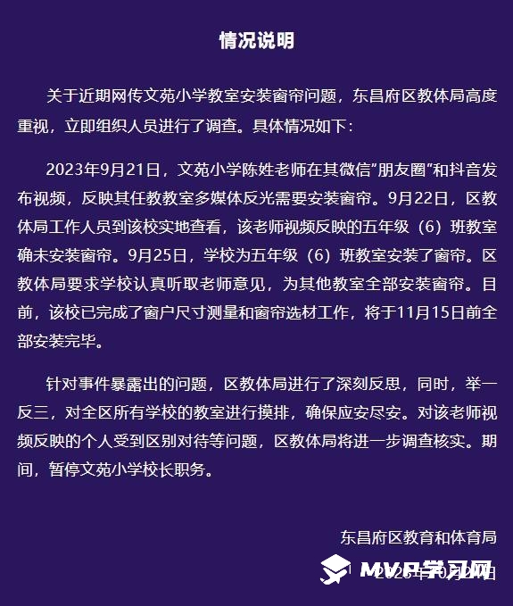 10月24日下午,東昌府區(qū)教育和體育局發(fā)布了關(guān)于文苑小學(xué)安裝窗簾問題的情況說明: