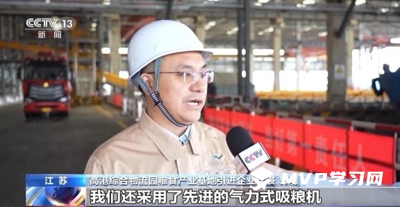 高港綜合物流園糧食產業基地引進企業代表 郭明:我們是長江沿線唯一一個挖入式碼頭,除了可以365天全天候無間斷作業之外,我們還采用了先進的氣力式吸糧機,它全程在管道內封閉作業,做到節糧減損。