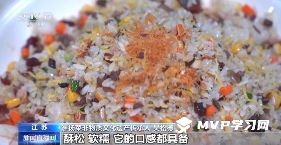 淮揚菜非物質文化遺產傳承人 吳松德:鐵板炒飯一粒粒攤開之后,看著米在“跳舞”,整個靈動的感覺特別好。從米的選擇來講,酥松、軟糯的口感都具備。