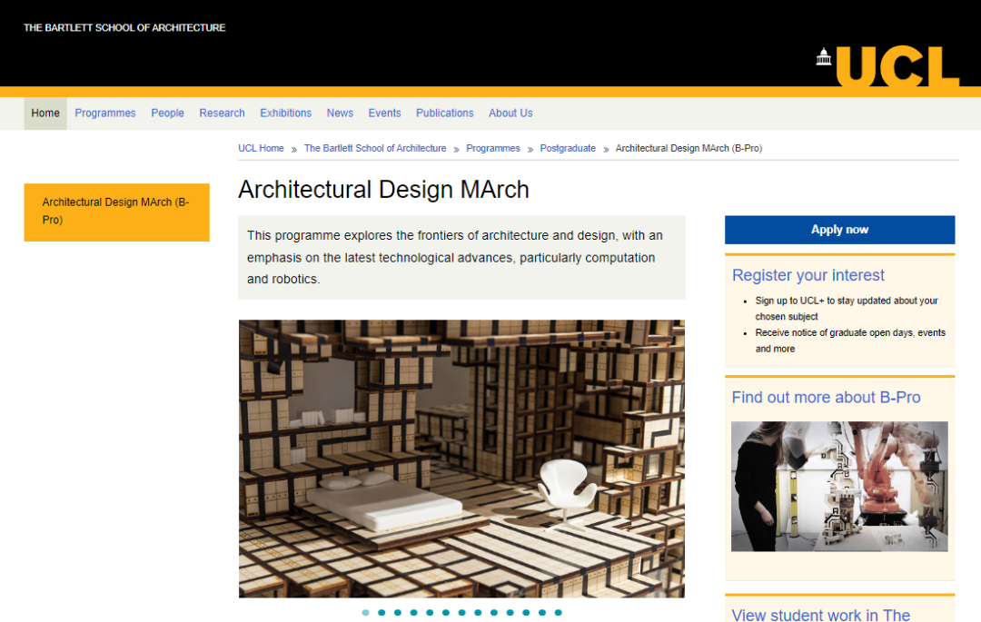 到了研究生選擇便多了起來,除了建筑學(MArch Architecture/Part2) 課程以外還有很受海外學生歡迎的建筑設計(MA Architectural Design)、生物集成設計 (MArch/Msc Bio-IntegratedDesign)等等。