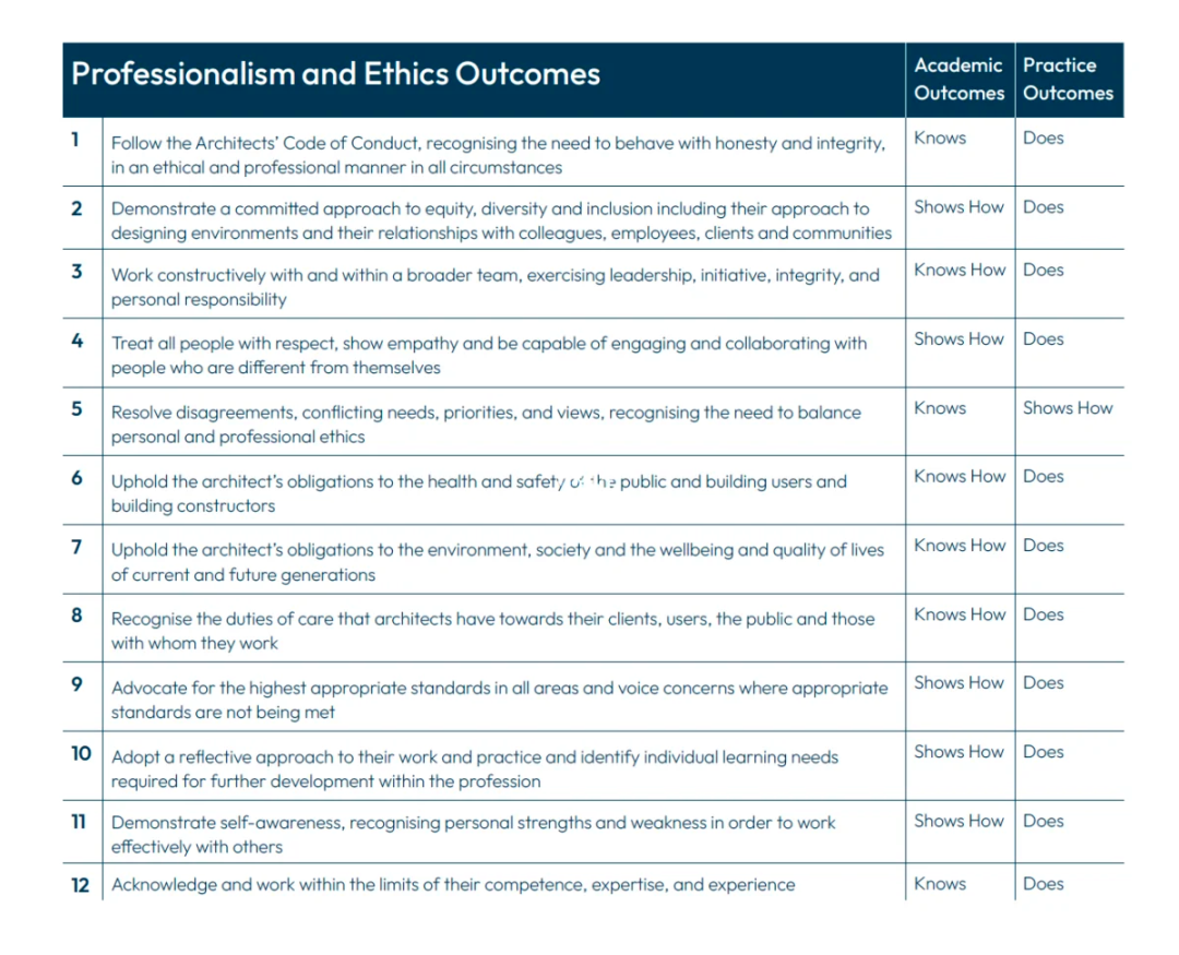 新體系的考核要求 (Outcomes) 分5個類別: 專業素養與行為準則(Professionalism and Ethics) 、設計 (Design) 、研究與分析 (Research andEvaluation)、大環境與建筑 (Contextualand Architectural Knowledge) 、管理,實踐與領導能力 (Management,Practice and Leadership),共49條。
