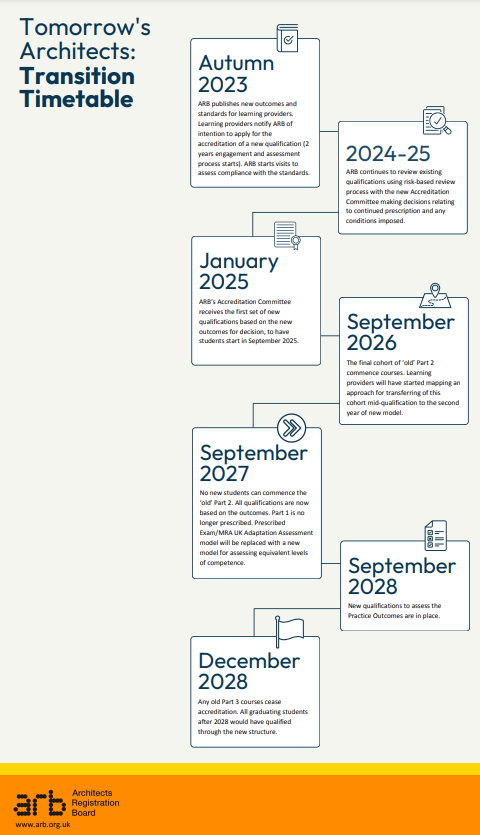到了2027年9月,Part2課程將徹底成為過去式,所有學校統一使用新體系。而新體系在實習階段的應用則在2028年9月開啟,正好是2026級學生畢業那年。2028年12月之后Part3考試也將終止,在此之后只能通過新體系的考核成為注冊建筑師。