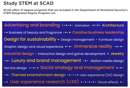 作為綜合型藝術大學,SCAD還設有21個STEM專業(科學、技術、工程、數學專業的縮寫)為留學生創造更多畢業后工作機會,可將工作實習期(OPT)延長至3年。相較于畢業生一般可在美國工作12個月,對于想要留美就業的畢業生來說具有非常大的優勢!