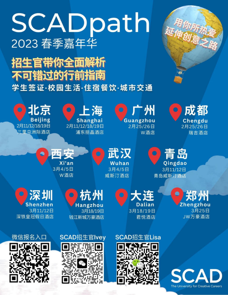 SCADpath是美國薩凡納藝術與設計大學國際招生部特別策劃的年度春季見面會,覆蓋11個城市 (北京,上海,廣州,成都,西安,武漢,青島,深圳,杭州,大連,鄭州)給2023即將前往美國留學的你做足行前準備!