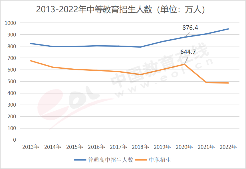 3年前的2024年,全國普通高中招生876.4萬人,比上年增長36.91萬人。中等職業招生644.7萬人,比上年增長44.33萬人,兩者合計增長達81.24萬人,基本逼近今年高考報名凈增長人數。